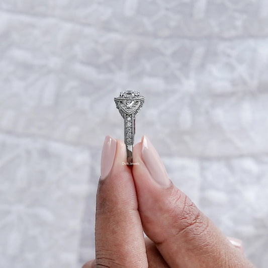 Milgrain Set Halo With Three Stone Engagement Ring
