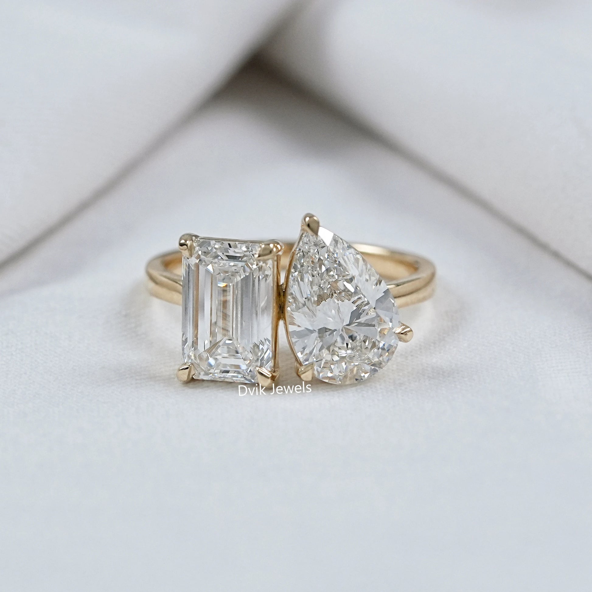 Emerald And Pear Cut Lab Diamond Two Stone Ring